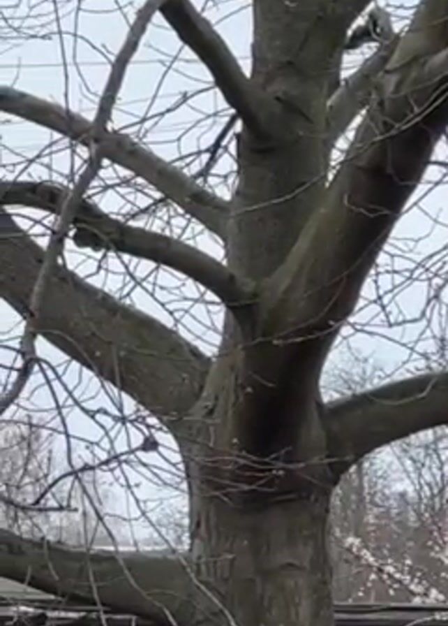 tree with bare branches against an overcast sky. The camera pans upward to reveal a house with a gray roof and chimney visible through the branches. The overall environment appears to be residential.