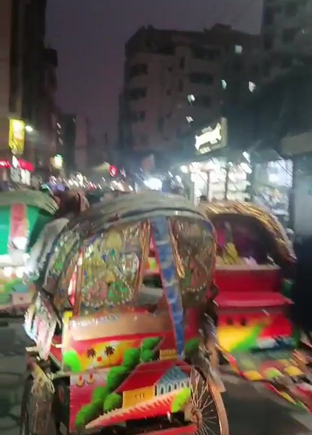The video captures a lively street scene in what appears to be a densely populated area, possibly in South Asia, likely at dusk or dawn given the lighting conditions. The street is filled with numerous brightly colored cycle rickshaws, a common mode of transportation in that region. People are walking along the street, some are wearing traditional clothing. The scene is bustling with activity and provides a glimpse into daily life in this urban environment. Shops with illuminated signs line the street, adding to the vibrancy.