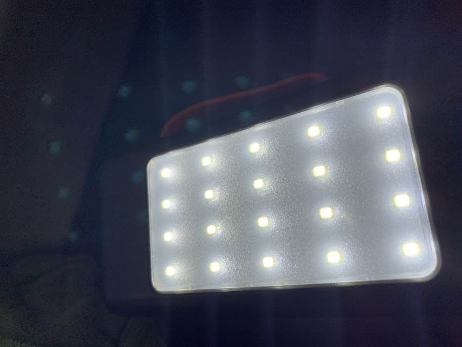 An illuminated rectangular LED panel is depicted in a low-light environment in Jos, Nigeria. The panel, centrally positioned and viewed from a slightly elevated angle, features twenty square-shaped, bright white light-emitting diodes arranged in a five-row by four-column grid. The surface covering the LEDs is translucent white with a subtle texture. A thin, light-colored bezel frames the panel, which has gently rounded corners. The background is dark, exhibiting multiple out-of-focus, teal-colored circular lights (bokeh) and a faint, elongated reddish reflection vertically positioned in the right-middle area. No individuals or specific actions are visible within the scene.