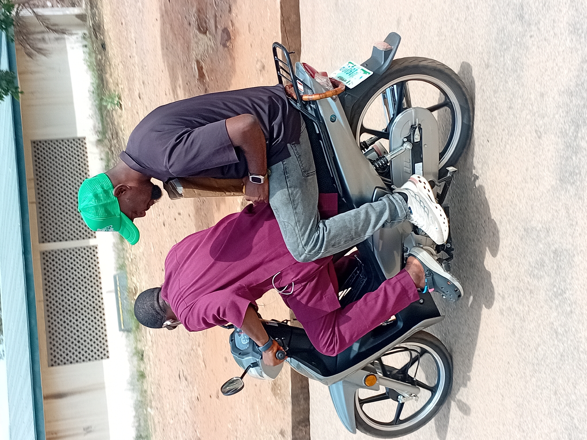 Two men are riding on a silver motorcycle on a paved surface. The driver is wearing a maroon long-sleeved shirt, dark pants, and grey Crocs, and is looking forward. The passenger is wearing a dark purple short-sleeved shirt, grey jeans, and white sneakers, and a green cap. The motorcycle has a license plate that reads "QJ0137 Lokoja." The background includes a building with a grated window and a dirt area with sparse vegetation.