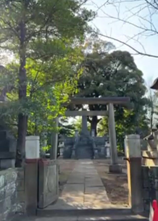 pathway to a Japanese shrine, framed by stone structures with capped posts. A stone path leads upwards to a Torii gate under the shade of large trees against a partly sunny sky. The scene includes details of stone lanterns or monuments on either side of the path beyond the gate, indicating a traditional or sacred area.
