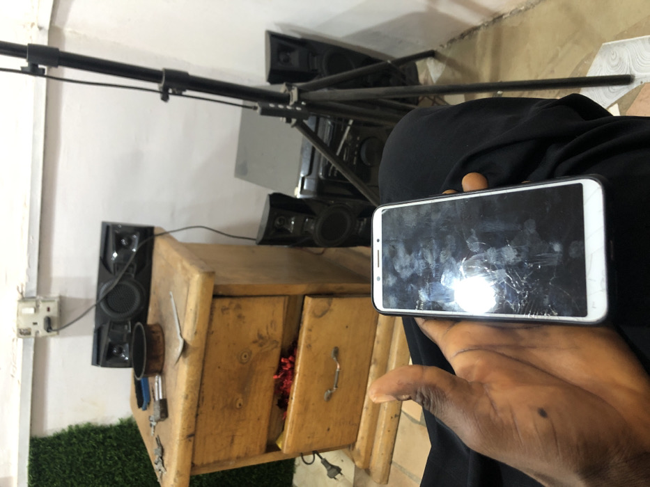 The image displays an indoor setting in Adankolo, Nigeria. In the immediate foreground, a dark-skinned right hand holds a white smartphone encased in black. The phone's black screen is significantly cracked, particularly in the lower-left quadrant, and covered with white smudges. The hand rests on a lap clad in dark fabric. To the left of the scene, a light-brown wooden cabinet with two drawers is positioned. The bottom drawer is partially open, revealing a piece of red fabric inside. On the cabinet's top surface, a small, dark metal pot, a spoon, and a small metal object resembling keys are present. Above the cabinet, mounted on a white wall, an electrical socket with a plugged-in cable is visible. Below the socket, a black horizontal speaker bar with a central circular speaker and two smaller speakers is mounted. Further to the right, a black stereo system is situated, flanked by two smaller black satellite speakers. To the far right, a tall, black metal tripod stands upright. The environment includes a plain white wall, a vertical section of artificial green turf on the far left, and light-colored, possibly patterned, tiled flooring.
