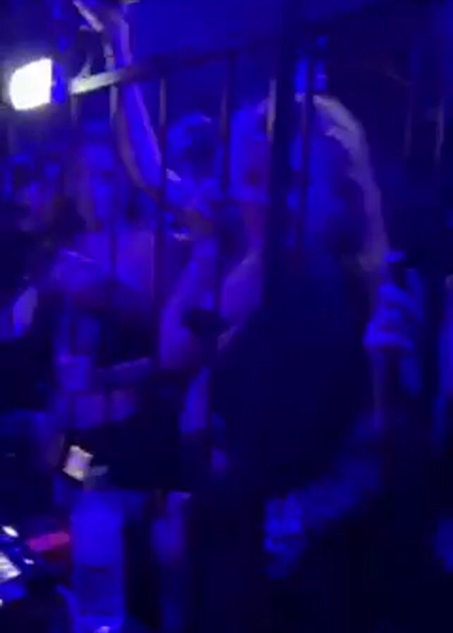 DJ booth inside what appears to be a nightclub. A young male DJ wearing a black t-shirt with a white graphic, a black baseball cap, and headphones around his neck is actively using the DJ equipment, including turntables and a mixer with glowing multicolored buttons. Behind the DJ booth, there's a cage-like structure with several people inside, mostly women, with their arms raised in the air, appearing to be dancing and enjoying themselves. The scene is lit with a blue light, and there are bottles of water on a shelf near the DJ. The focus is on the DJ and the interaction with the crowd within the cage.