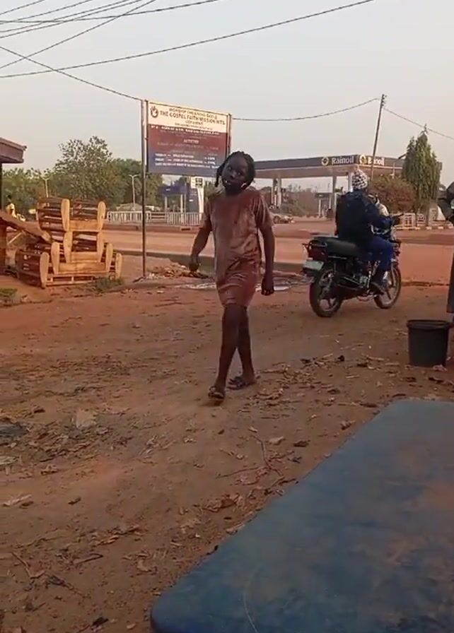 young girl with braids, dressed in a short brown dress, walking across a dusty, dirt-covered area. She is wearing sandals. In the background, there's a gas station, a billboard, motorcycles, and a person carrying something on their head. The scene is set outdoors, with buildings, power lines, and some trees visible. A blue table sits in the lower right corner of the frame. The girl appears to be walking towards the camera and seems to be chewing something.