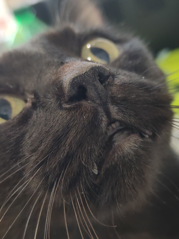 - "This is a close-up, upward-angled photograph of a black cat's head, centered and filling the majority of the frame" by FM-o6dT83, licensed under CC BY 4.0