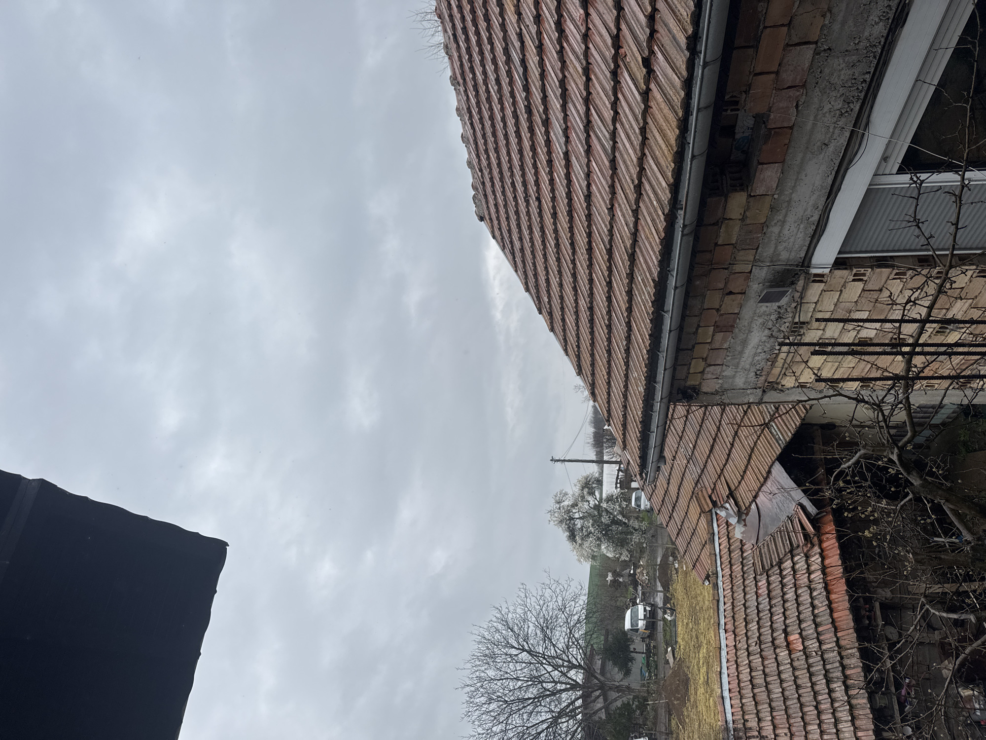 view in Polikraishte, Bulgaria, likely from an elevated position. The focus is on adjacent buildings with tiled roofs. One building has a visible window and brickwork. A black, angled object is visible in the lower left. Bare trees and early signs of spring foliage are in the background. A cloudy sky dominates the upper portion of the image. The overall scene appears muted and overcast. Vehicles are partially visible in the background, suggesting a residential area.