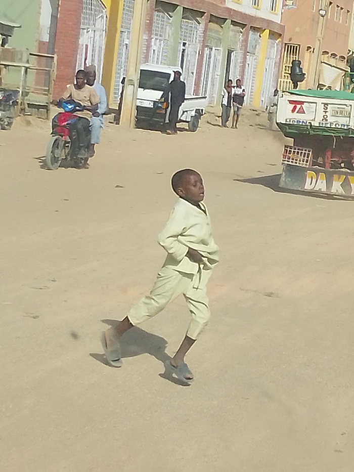 The image depicts a street scene in Mariri, Nigeria. In the immediate foreground, a young Black male child, approximately 5-7 years old, is shown mid-stride, moving from left to right across a light-colored, unpaved or dusty road. He wears a light yellowish-tan long-sleeved tunic and matching cropped pants, with light grey slip-on sandals. His gaze is directed forward and slightly upwards, with his mouth slightly ajar. In the mid-ground to the left, two Black adult males are riding a red and black motorcycle away from the viewer. The driver wears a light brown shirt and dark pants, while the passenger behind him is clad in a light blue garment and a light-colored cap. Further left, a white pickup truck is parked, and a dark-clothed figure stands near its rear. In the mid-ground to the right, a large truck with a green cargo bed and a red undercarriage is partially visible, displaying text including "HORN BEFORE" and "DA KYA". Several indistinct figures are visible walking on the far side of the street. The background consists of multi-story buildings with brick and painted facades, featuring numerous windows, some with white frames and security bars. Overhead utility lines and poles are visible. The scene is illuminated by bright daylight, casting visible shadows.