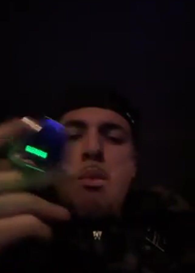 two young men inside a vehicle. The man in the foreground is holding a small, round object that emits a green light, possibly a vape or similar device, to his mouth. The background is very dark and appears to be nighttime. The second man is partially visible, wearing a dark hooded jacket, and is looking to the side. Music is playing in the background.