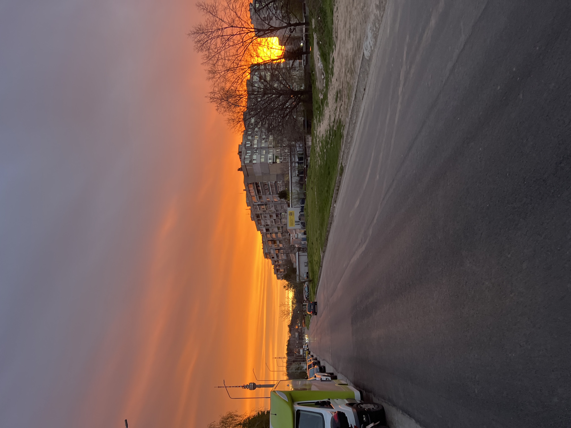 The image depicts a street scene in Ruse, Bulgaria, at sunset. The sky is awash with orange and gray hues, indicating the transition from day to night. The view is oriented along a street lined with residential buildings on one side and a sidewalk and grassy area on the other. Several trees, some bare of leaves, frame the buildings and skyline. A row of parked vehicles, including a green truck and a motorcycle, are visible along the curb. A television tower is visible along the left side of the image. The pavement of the street shows signs of recent rain or moisture. The overall impression is of an urban environment at the end of the day.