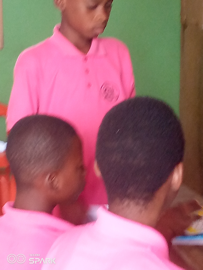 The scene, set in an indoor environment in Ajaokuta, Nigeria, features three young individuals