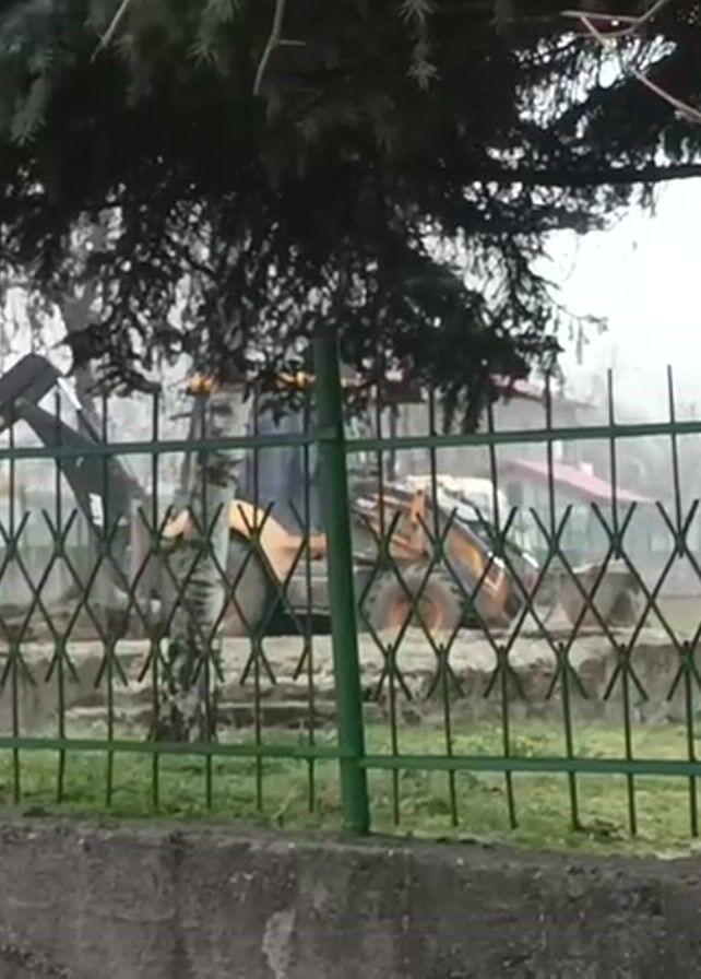 The scene is an overcast outdoor shot. A backhoe loader is visible through a green, diamond-patterned metal fence. The fence is mounted on a concrete base. Trees with bare branches are scattered throughout the background. One tree trunk is in the foreground. Buildings are partially visible behind the trees and the backhoe loader. The ground is covered in grass and dirt. The visibility is somewhat reduced, possibly due to mist or fog.