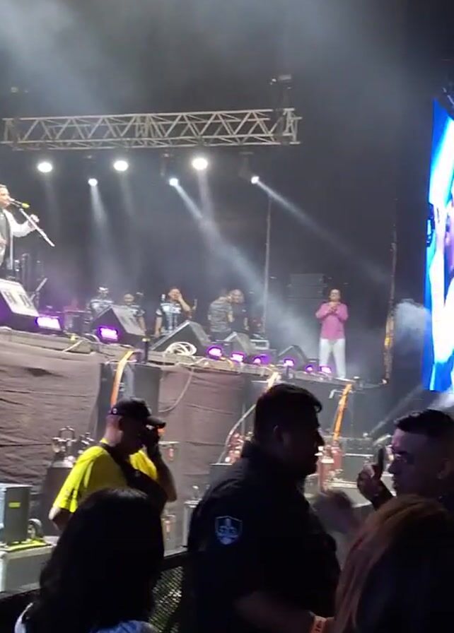 Here's a forensic description of the video: **Scene:** The video appears to be taken at a live music concert or performance. The camera is positioned within the crowd, relatively close to the stage. **People:** * **Performers:** A band is performing on stage. A lead singer is visible, dressed in a white blazer and black shirt. Other band members are also present, playing various instruments. * **Audience:** A large crowd of people is present, watching and listening to the performance. Many people are holding up their phones to record the event. * **Security:** Security personnel wearing dark uniforms are positioned near the stage and in the crowd. * **Event Staff:** There are some staff wearing yellow shirts near the stage. **Objects:** * **Stage:** A large stage is present, covered with material, and with visible speakers, instruments, and lighting equipment. * **Lighting:** Stage lighting is in use, including spotlights and general illumination. * **Speaker system** Large sound system. * **Digital screen** Showing the band member. **Actions:** * **Performing:** The band is actively performing music, with the lead singer singing and band members playing instruments. * **Watching:** The audience is observing the performance, listening to the music, and recording with their phones. **Interactions:** * The band is interacting with the audience through their performance. * Security and staff are monitoring the crowd and the stage area. **Environment:** The concert appears to be taking place outdoors, during the evening, given the lighting and visibility of the sky. The surroundings appear to be part of a stadium, evidenced by the multiple levels of seating. Smoke/haze is present, likely produced as part of the stage effects.