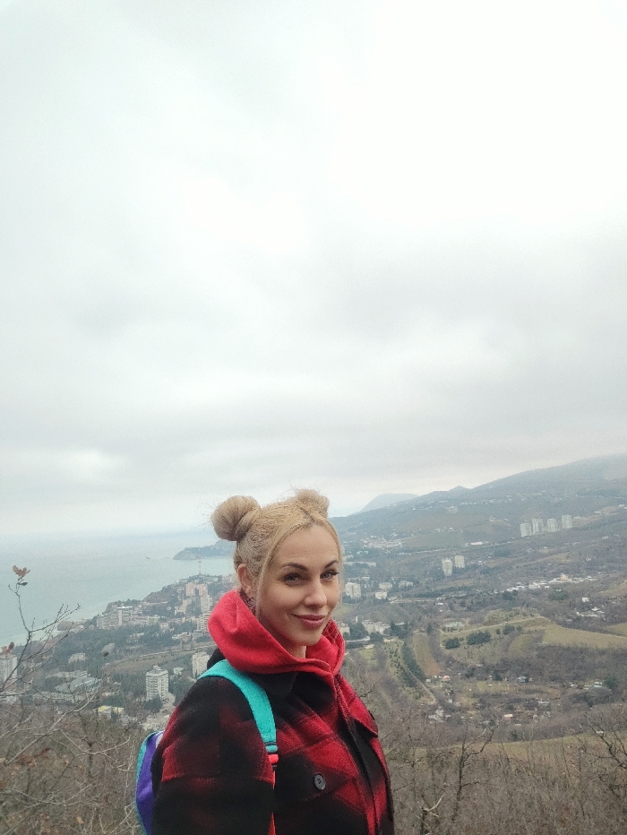 - "An outdoor portrait photograph captures a blonde-haired female subject from the waist up, positioned on a hillside overlooking the city of Partenit, Ukraine, under an overcast sky" by FM-pJyc73, licensed under CC BY 4.0