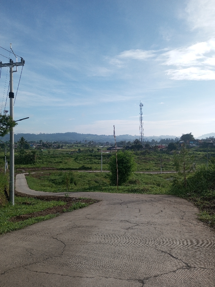 A low-angle shot reveals a cracked concrete road splitting into a left turn. Lush green fields extend beyond the road, dotted with sparse vegetation and a distant cell tower. A line of hills forms the horizon under a bright blue sky with wispy clouds. A utility pole stands on the left, partially obscuring the scene. The overall landscape conveys a sense of rural tranquility.