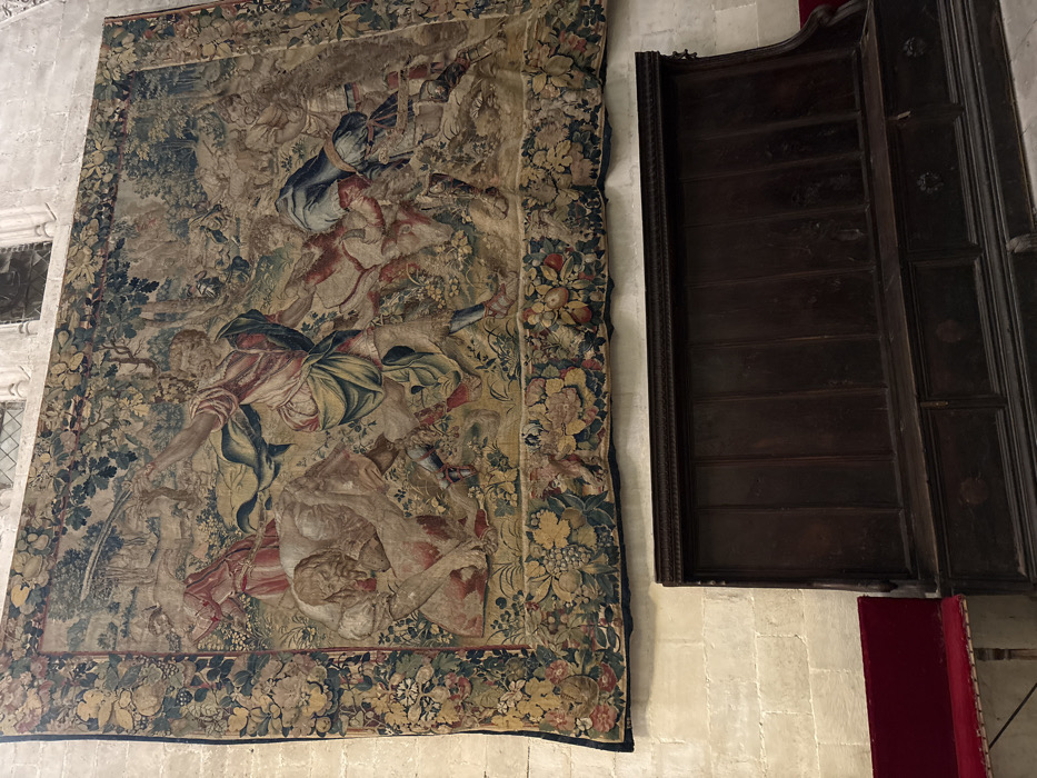 A large, faded tapestry, approximately 3-4 meters in height and width, dominates the upper portion of the image, affixed to a light-colored, rough-hewn stone wall inside what is identified as a building in the city of Cuenca, Spain, likely its Cathedral
