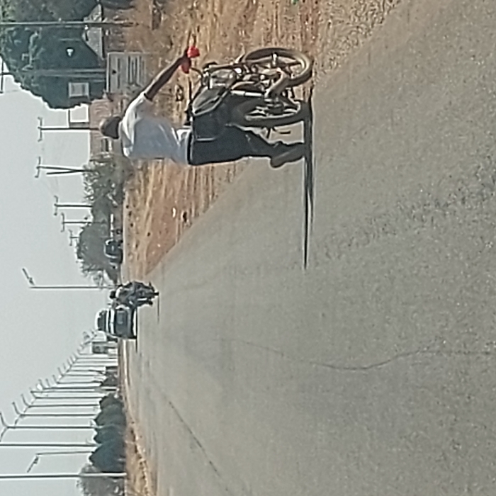 The image captures a daylight scene on an asphalt road in the city of Haifam, Nigeria. In the right foreground, an adult male, wearing a white shirt, dark trousers, and a dark head covering, pushes a dark motorcycle forward on the road's shoulder, grasping the left handlebar. The motorcycle features red handlebar accents and a dark bag secured to its rear. The subject casts a distinct shadow to his left. In the midground, another individual operates a motorcycle moving away from the viewer on the main thoroughfare. Further distant, a light-colored sedan with roof-mounted items also proceeds in the same direction. The two-lane road is bordered on the left by a linear arrangement of modern streetlights and on the right by utility poles with overhead lines. The surrounding environment consists of dry, sparse vegetation and indistinct distant structures under a hazy sky.
