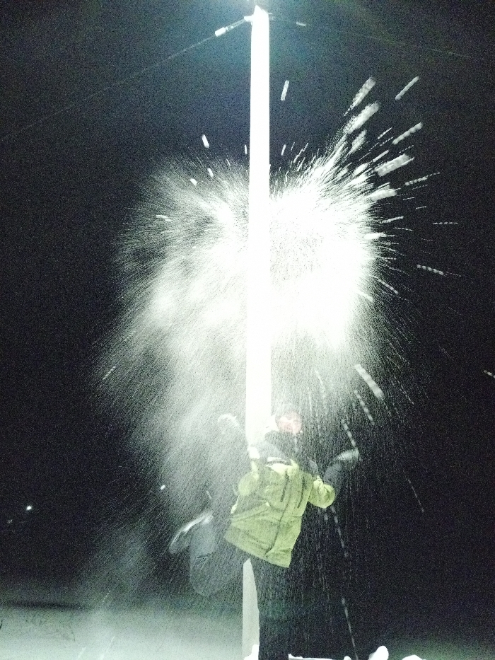 A nighttime scene in Старый Шагирт, Russia, depicts a single individual positioned near a brightly illuminated, tall vertical pole. The person is dressed in a light green winter jacket and dark lower garments. A significant volume of white particulate matter, consistent with snow or ice, is observed forcefully erupting outwards from the mid-section of the pole, creating a radial, starburst-like splash pattern that is intensely lit against the dark background. The individual's arms appear raised, and their form is partially obscured by the pole and the illuminated particles. The ground beneath the immediate action is covered in snow. The surrounding environment is dark, indicating night conditions with a strong, localized artificial light source.