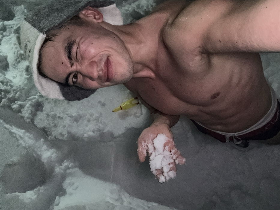 A shirtless man in a sauna hat lies on his side, holding a handful of snow. He winks at the camera with a playful expression. A small, yellow object rests on the snow near his arm. The background is filled with snow or ice, suggesting a cold environment or ice bath setting. He is wearing briefs.