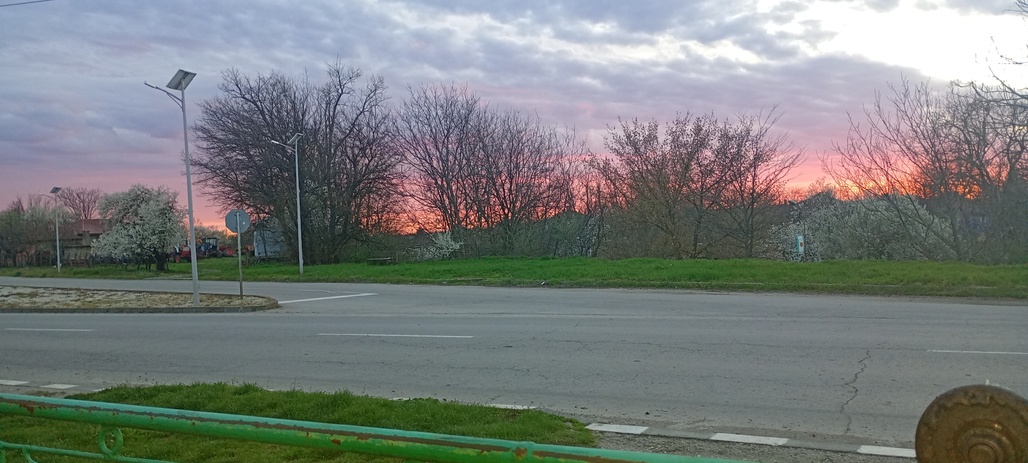 road in Alfatar, Bulgaria, at sunset. The sky is filled with clouds illuminated in hues of pink and orange. A road with white lines runs through the center of the frame. Green grass is visible on either side of the road. On the left side of the road, there is a streetlight, a tree with white blossoms, and a sign. In the background, there are trees with bare branches and other trees with white blossoms. A rusty green railing is visible in the foreground.