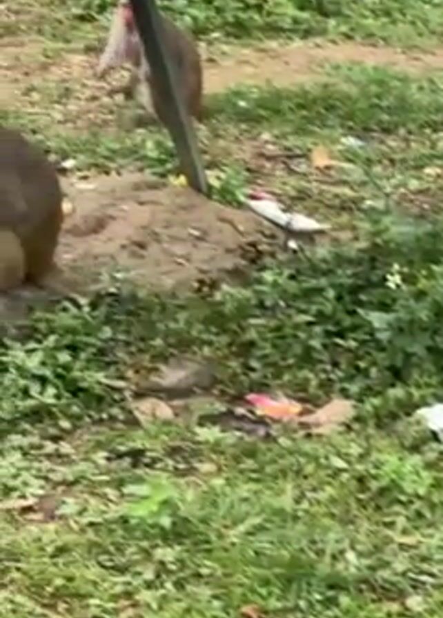 group of monkeys in a park-like environment. Some are sitting or standing on the grass, while others are near a red and white pole. One monkey is climbing the pole and appears to be eating something. There is trash scattered around the area. A sign is visible in the background, partially obscured.