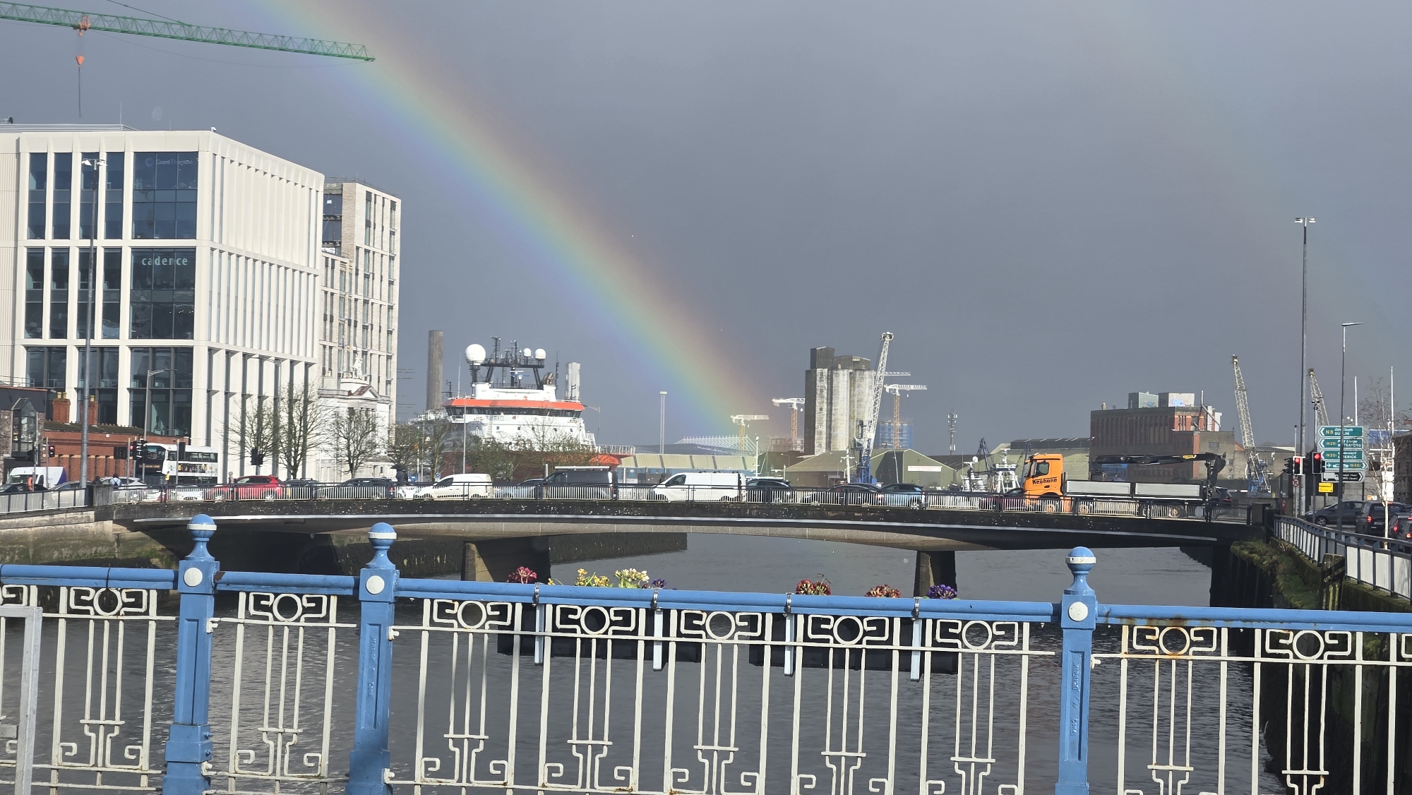 This image depicts a wide urban landscape in Cork, Ireland, specifically the Docklands area, featuring the River Lee and surrounding infrastructure. In the foreground, a decorative blue and white metal railing, characteristic of a bridge or quayside, runs horizontally across the bottom of the frame. Beyond this, the dark water of the River Lee flows left to right. A multi-lane bridge spans the river, carrying vehicular traffic. On the bridge, an orange articulated truck with "Keskomi" visible on its cab is heading towards the right. Numerous cars and vans are present on the bridge and adjacent roads. On the left bank of the river, a modern, multi-story white building, identified by the "cadence" and "cadence design systems" signage on its facade, dominates the skyline. This is part of the Navigation Square development. To its left, a smaller red-brick building is visible. A white bus and several cars are on the road in front of these buildings. A tall green construction crane boom extends into the upper left quadrant of the sky. In the mid-ground, a large white and orange vessel with multiple antennae and radar domes on its superstructure is docked, positioned behind the bridge and industrial structures. The background consists of a dark, overcast sky. A prominent, vibrant rainbow arches from the mid-left towards the upper right, contrasting sharply with the somber sky. Below the rainbow, various industrial buildings, silos, and smaller cranes are visible, indicative of a working port or industrial zone. Traffic lights are visible on the right, along with a road sign indicating directions for N8, N25, N27, N71, and South Link. The scene is illuminated by partial sunlight, creating a dynamic lighting condition where the foreground is brighter than the background sky. No individual people are distinctly visible, but vehicles on the bridge and roads suggest human presence.