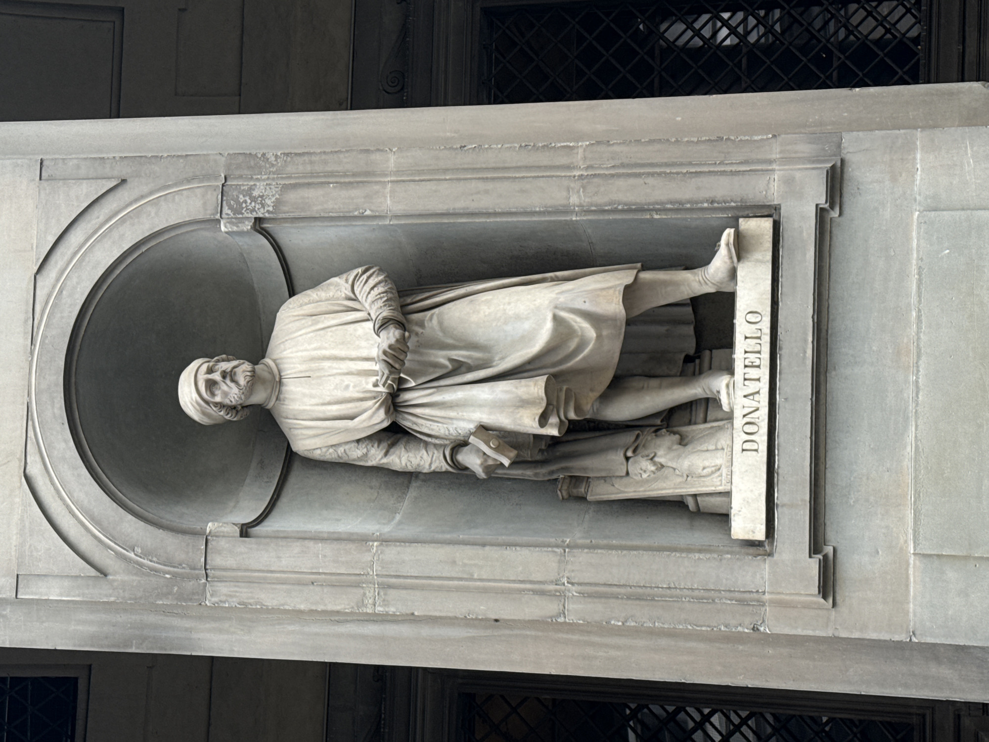 - "A light gray stone statue of Donatello is positioned within an arched niche on the exterior facade of the Uffizi Gallery in Florence, Italy" by FM-6dKsK2, licensed under CC BY 4.0