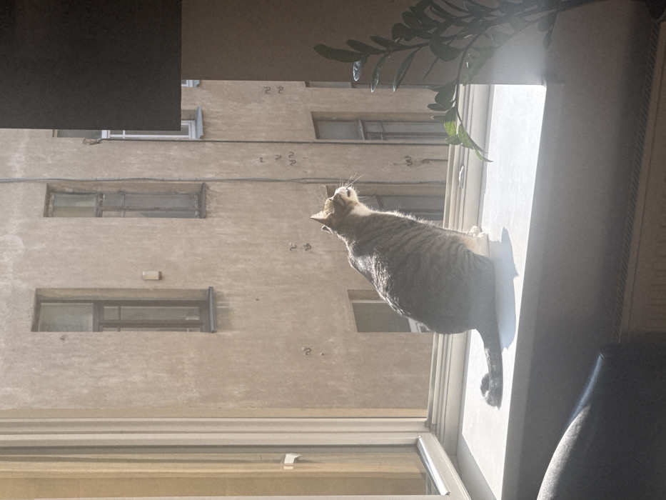 - "A tabby cat with white facial markings and paws is seated on a wide, white interior windowsill, facing right and looking slightly upward" by FM-6rDCV2, licensed under CC BY 4.0
