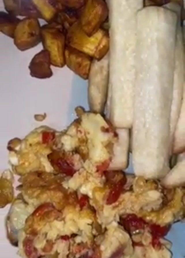 A plate with three food items is shown from a top-down, static perspective. The plate is white with a partial light blue border. On the plate are diced fried plantains, what appear to be fried yams cut into thick sticks, and a tomato and egg scramble.