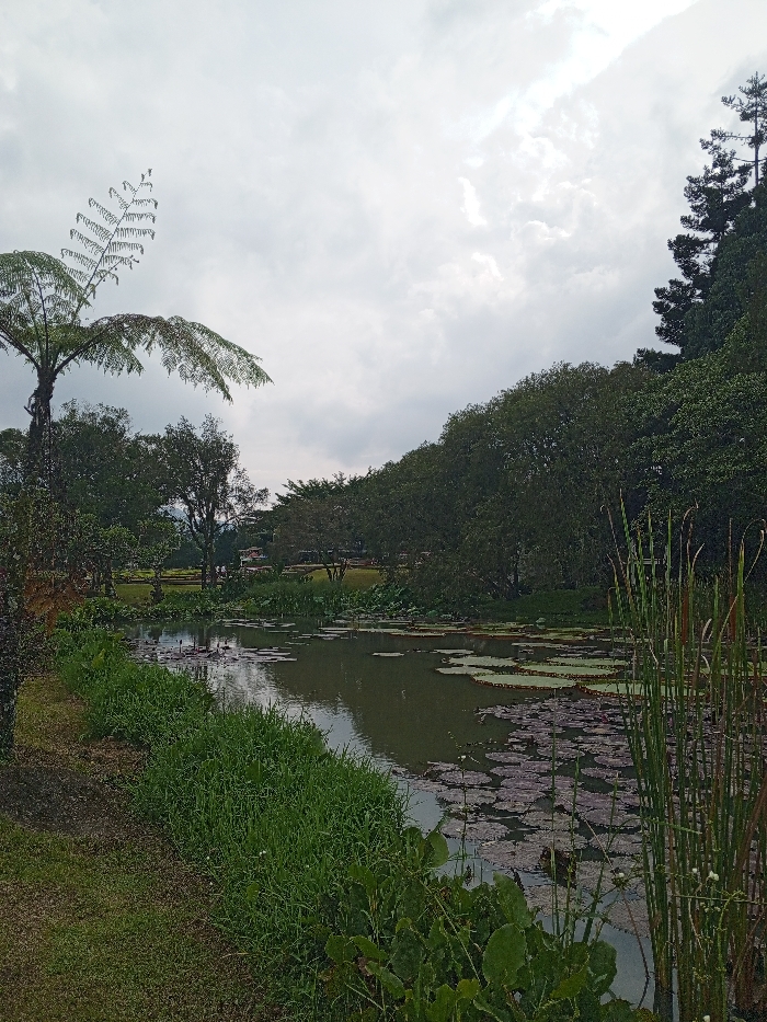 A placid body of water, possibly a pond or a slow-moving river, is abundant with lily pads. Lush greenery lines the near bank, transitioning into denser trees and foliage along the far bank. The sky is overcast, casting a muted light over the scene. A tree fern is on the left, and tall reeds stand on the right.