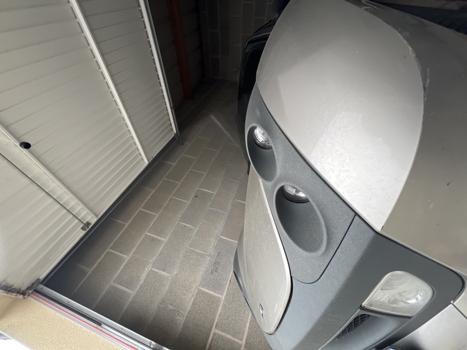 The scene depicts the front section of a dusty, light-colored (beige/champagne) Smart Roadster two-seater sports car parked inside a garage or storage unit