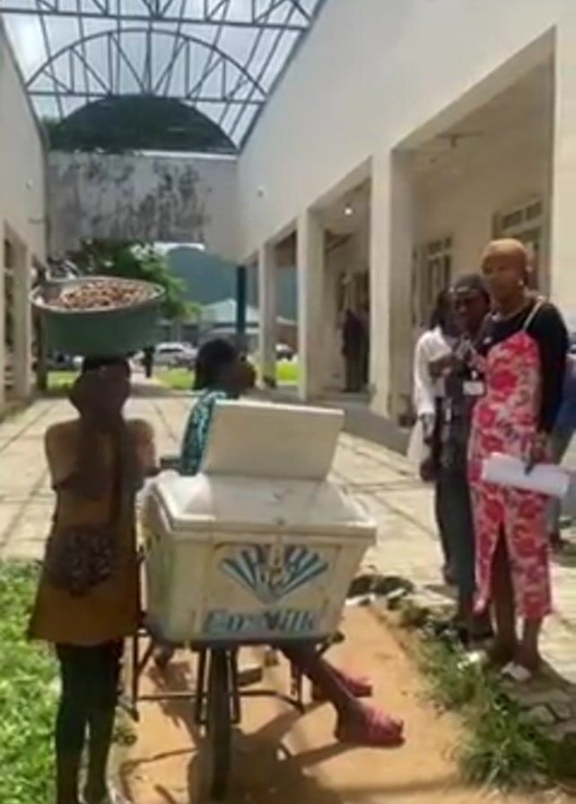 scene outdoors. On the left, a person carries a full basket on their head. A tricycle, with a white container labeled "FAR MILK" attached, stands between the basket carrier and a seated person. To the right, a group of people stands and interacts, with one individual in a floral dress holding papers. The setting appears to be a covered walkway, with white pillars, a green roof, and natural light filtering through.