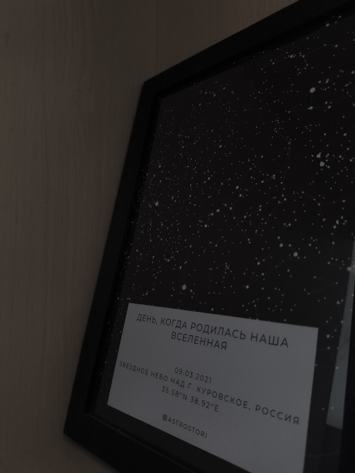 A black-framed poster depicting a starry night sky is positioned indoors, leaning against a light brown wall or furniture surface. The poster's dark background is covered with numerous white dots representing stars, with some connected by faint white lines forming constellations. A white rectangular text block is centrally located towards the bottom of the poster. This block displays text in black font, which includes: "ДЕНЬ, КОГДА РОДИЛАСЬ НАША ВСЕЛЕННАЯ" (DAY WHEN OUR UNIVERSE WAS BORN), the date "09.03.2021", "ЗВЁЗДНОЕ НЕБО НАД Г. КУРОВСКОЕ, РОССИЯ" (STAR SKY OVER THE CITY OF KUROVSKOYE, RUSSIA), geographical coordinates "55.58°N 38.92°E", and the social media handle "@ASTROSTORI". The scene is characterized by dim, even lighting, highlighting the reflective surface of the poster. No individuals or specific actions are depicted.