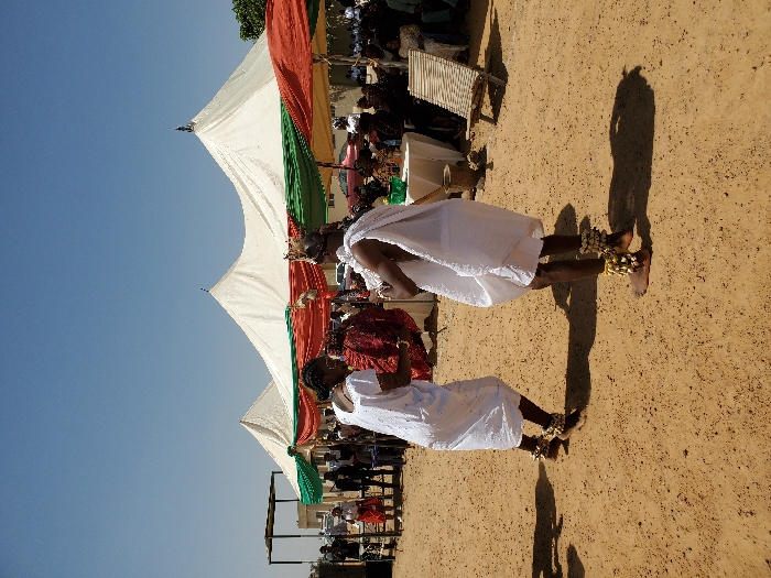The image depicts an outdoor cultural event in Bar Gada, Nigeria, under a clear blue sky