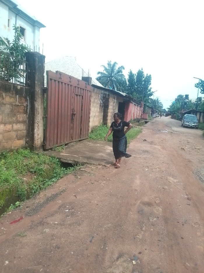The image depicts an unpaved, reddish-brown dirt road in the city of Unknown, Unknown, under an overcast sky. In the foreground-midground, an adult female with dark skin, wearing a dark short-sleeved top, a dark long skirt, and light-colored sandals, walks from left to right along the road. Her right hand is near her hip, and her left arm is slightly bent back. To the immediate left of the female is a narrow, vegetation-filled drainage ditch, spanned by a concrete slab forming a gate entrance. Adjacent to this, a sturdy block wall, topped with metal fencing, runs parallel to the road. A large, rusty, corrugated metal gate with an integrated pedestrian door, secured with a visible lock, is set within this wall. Further left and behind the wall, a white building with visible windows is partially seen. Along the right side of the road, a line of buildings and walls are present, including a light-colored block wall and structures with corrugated metal roofs and a reddish-brown painted wall. A dark-colored minivan or small bus is parked on the right side of the road in the mid-background. Further down the road, another individual is faintly visible walking, and utility poles with streetlights line the path. Palm trees and other green foliage are abundant throughout the scene, bordering properties and extending into the background. The road itself shows evidence of wear, with uneven surfaces, tire tracks, and scattered debris.
