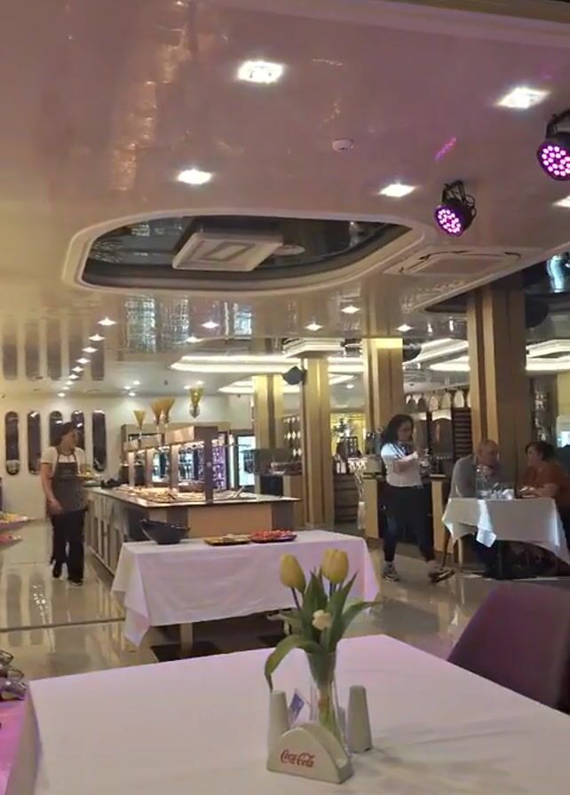 interior of a restaurant with a buffet area. Multiple tables with white tablecloths and flower arrangements are visible, and people are seated at some of them. Staff members are walking around, presumably attending to customers. The restaurant is well-lit with a modern lighting system, including colored stage lights. The overall ambiance suggests a formal or upscale dining experience.