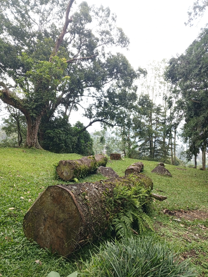 Mossy logs scattered on a green hillside form a foreground. A large tree with sprawling branches stands to the left, while a cluster of taller, slender trees reaches towards the overcast sky on the right. Smaller shrubs fill the space behind the logs. The landscape suggests a serene, slightly wild park setting.