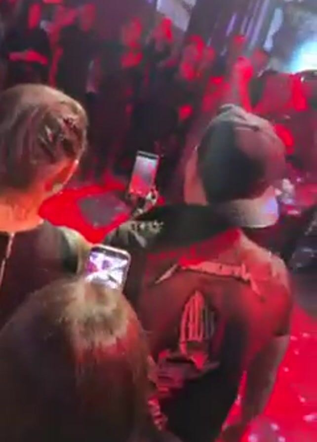 crowded club with people dancing under red and pink lights. Confetti is falling from the ceiling. Several people are holding up their phones, presumably recording the scene. The camera pans across the crowd and focuses on a man wearing a black jacket with silver embroidery.