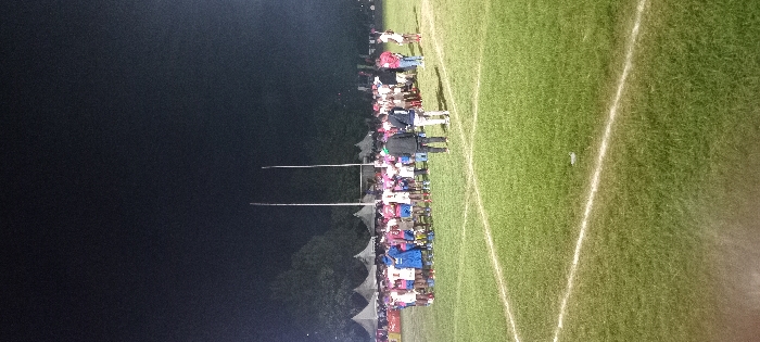 The image depicts a nighttime scene on a floodlit rugby pitch, likely located at the RFUEA Ground in Nairobi, Kenya. In the foreground, green grass is visible with white boundary lines. Two sets of white rugby goalposts stand prominently in the mid-background. Approximately 40-50 individuals are assembled on the field, divided into two distinct groups. On the left, a large group of individuals, primarily male, are lined up, wearing what appear to be red and white rugby uniforms, with one individual prominent in a blue poncho or jacket. On the right, facing them, is another large group, also mostly male, wearing white and pink rugby uniforms; jersey numbers, such as '1' and '3', are partially visible on some. Between these two groups and slightly closer to the viewer, several adults stand, appearing to be coaches, officials, or organizers. One individual wears a dark jacket with a green collar or hood, while another next to them wears a white shirt and dark trousers. In the background, behind the assembled teams, a series of white, pyramid-shaped tents are arranged in a line, illuminated by artificial lighting. Trees are silhouetted against the dark night sky beyond the tents. The scene suggests a formal gathering, such as a team introduction or ceremony, during a rugby event.