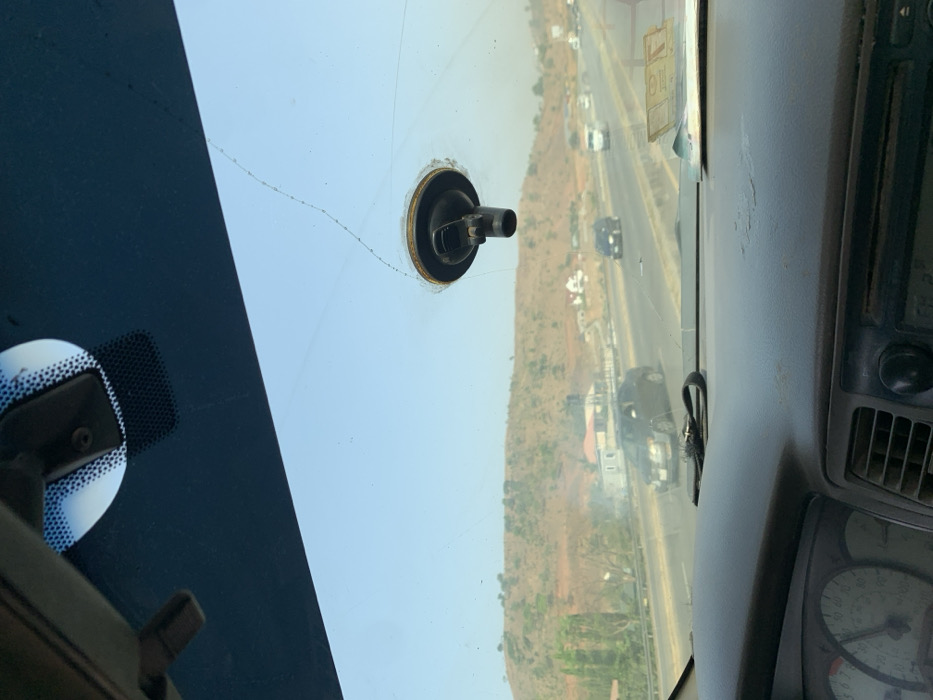 The image depicts a daytime scene from inside a vehicle looking through a cracked windshield onto a multi-lane highway in Kugbo, Nigeria