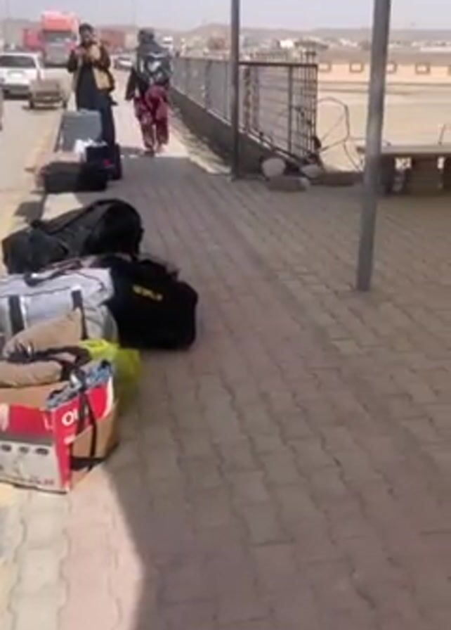 paved area, possibly a border crossing or waiting area, with luggage piled up on one side near a road with trucks and vehicles. People are walking around, some with luggage. The camera pans to the right, showing an open-sided shelter with benches and people sitting or standing. There is barbed wire visible in the background. The overall impression is of a dusty, somewhat desolate environment.