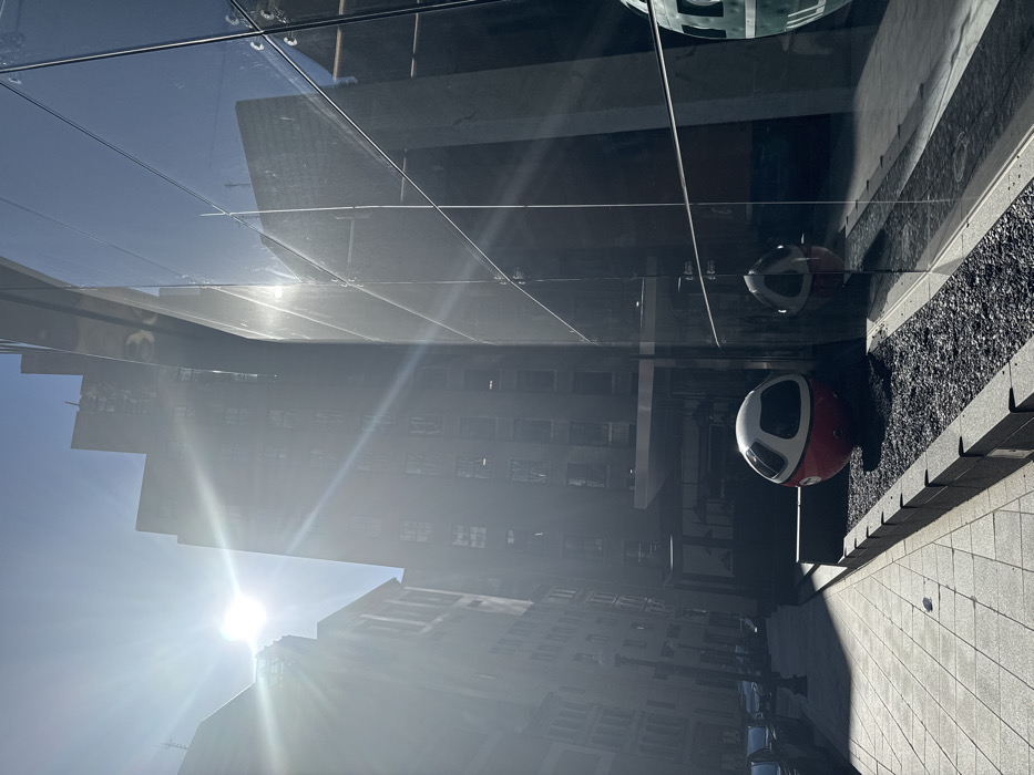 The image displays an urban street scene in the Seaport District of Boston, Massachusetts, specifically resembling the area near Atlantic Wharf on Congress Street. The scene is illuminated by bright overhead sunlight, causing prominent lens flare across the upper frame. On the right, a multi-story modern building features a facade constructed from large, segmented panels of reflective dark glass, which mirrors the environment. To the left, a traditional multi-story building, likely brick, recedes down a sun-drenched street. In the foreground, situated within a landscaped strip of dark gray gravel bordered by low concrete blocks, rests a prominent spherical art installation. This sculpture is predominantly red in its lower half and white in its upper half, featuring a distinct black and gray rimmed horizontal "eye" or viewport, characteristic of a Poké Ball. The reflective glass facade of the adjacent building clearly mirrors this red and white sphere, and partially reflects a second, similar spherical object, colored green and white, positioned further out of frame to the right. A paved sidewalk occupies the lower-left of the image, extending into the distance where several parked vehicles are faintly visible along the street. No individuals are present.