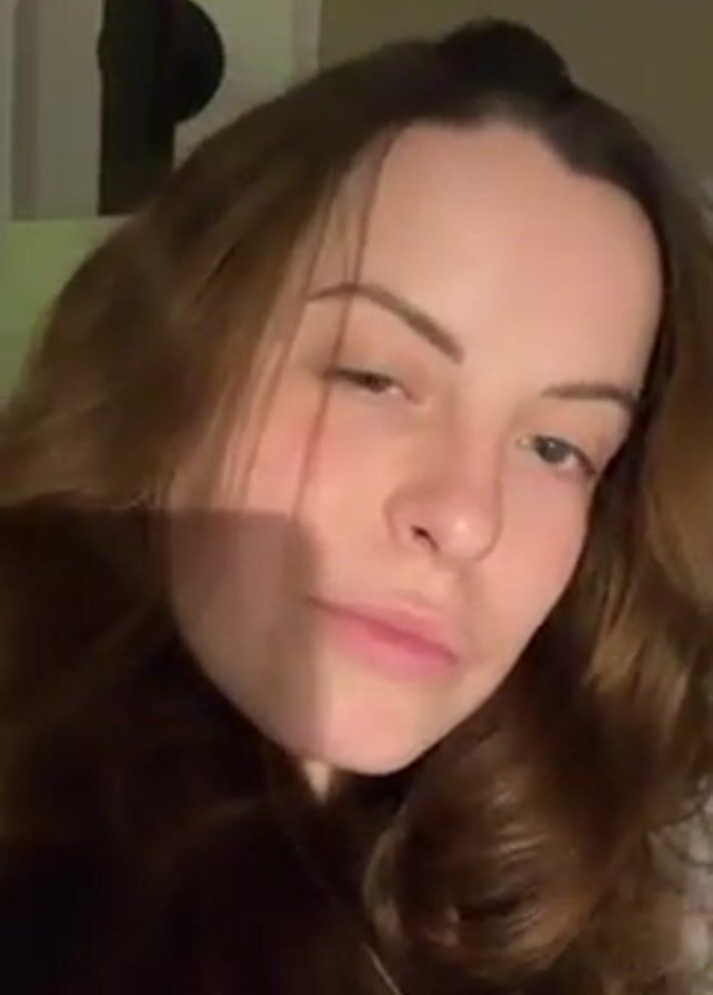 A woman with long brown hair is looking at the camera. She is lying down and running her hand through her hair. She appears to be indoors. The lighting is dim, and there is a white wall in the background.