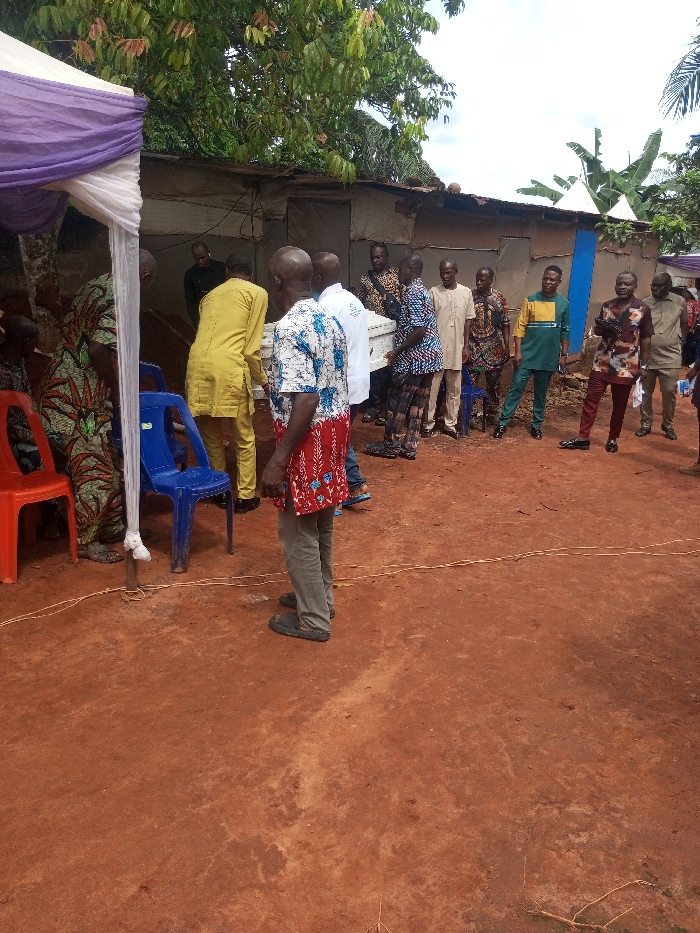 This image depicts an outdoor gathering of approximately 15-20 adult males on unpaved, reddish-brown ground in Oko Town, Nigeria. A central group of individuals is actively carrying a white coffin, moving it from the left side of the frame towards the right. One man in a yellow tunic and trousers is bent over near the front of the coffin, appearing to assist with its transport. Other men, dressed in a mix of patterned traditional Nigerian attire and solid-colored tunics or shirts with trousers, stand observing the procession. A man in a red and white patterned shirt over grey trousers is prominently positioned in the foreground, facing away from the viewer. To the left, a partial view of a temporary tent structure with purple and white fabric draping is visible, adjacent to a blue plastic chair and a partially visible red plastic chair. A wooden stake supports the tent fabric. In the background, a dilapidated single-story building with a corrugated metal roof, exposed rafters, and walls of varied materials (some appearing to be concrete blocks or mud) is present. A section of the building's wall on the right is painted blue. Lush green foliage and trees, including what appear to be banana leaves, are visible above and around the structure. The sky is overcast. A thin orange-colored cord lies on the ground in the immediate foreground.