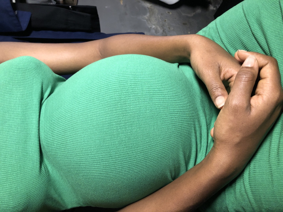 A close-up shot reveals a pregnant person in a light green, ribbed dress. Their dark-skinned hands are clasped over their stomach. A portion of their arm is visible above the belly. In the background, a dark blue garment and a black bag rest on a gray surface. The image focuses on the pregnancy.