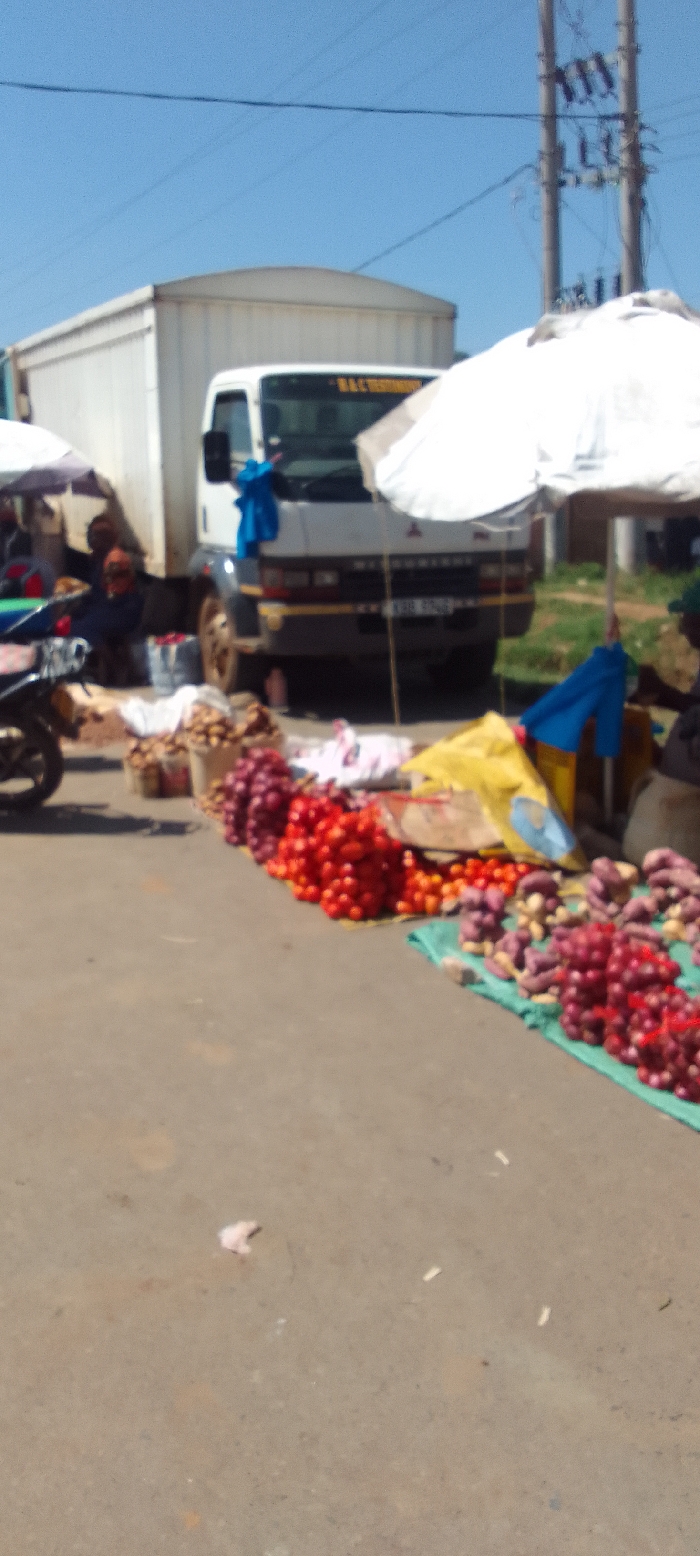 street market scene in Kakunga, Kenya, located at latitude: 0.375, longitude: 34.854. There are various vendors selling produce on the side of a paved road. A white truck with a yellow stripe is parked on the right side of the road. The vendors are selling produce such as tomatoes, potatoes, onions, and other vegetables. A few people are visible in the background, but their faces are obscured. The sun is shining brightly, and there are several power lines running overhead.