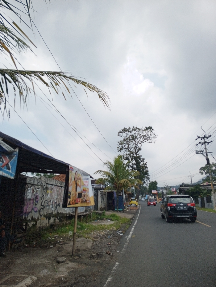 The image displays an outdoor, roadside scene under an overcast sky. In the foreground on the left, palm fronds hang into the frame, partially obscuring the upper corner. Below them, a dilapidated structure with a dark, corrugated roof and graffiti-covered concrete walls is present. An advertisement banner, featuring a woman and packaged food items, is vertically mounted on a wooden pole directly in front of this structure, facing the asphalt road. A person wearing dark clothing is partially visible, seated in the shaded area beneath the structure's roof on the far left. The ground adjacent to the road is unpaved, composed of dirt and sparse vegetation. The two-lane asphalt road extends into the distance, showing a white line on its right shoulder. A black SUV, bearing license plate "D 1693 WS," is traveling away from the viewer in the right lane. Further down the road, a red car and a yellow car are also visible. On the right side of the road, a utility pole with multiple cross-arms and power lines stands. A small palm tree is positioned on the left side, between the foreground structure and the road. In the background, large trees with visible branches, additional utility poles, and distant hills are discernible beneath the cloudy sky, which has brighter patches. The scene is located in the city of Multhan, India.