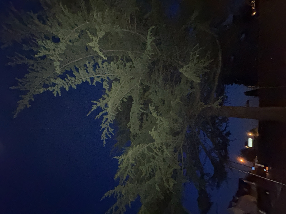 - "A large evergreen tree dominates the frame, its branches reaching toward the upper left corner against a dark blue, almost black, sky" by FM-iKko62, licensed under CC BY 4.0