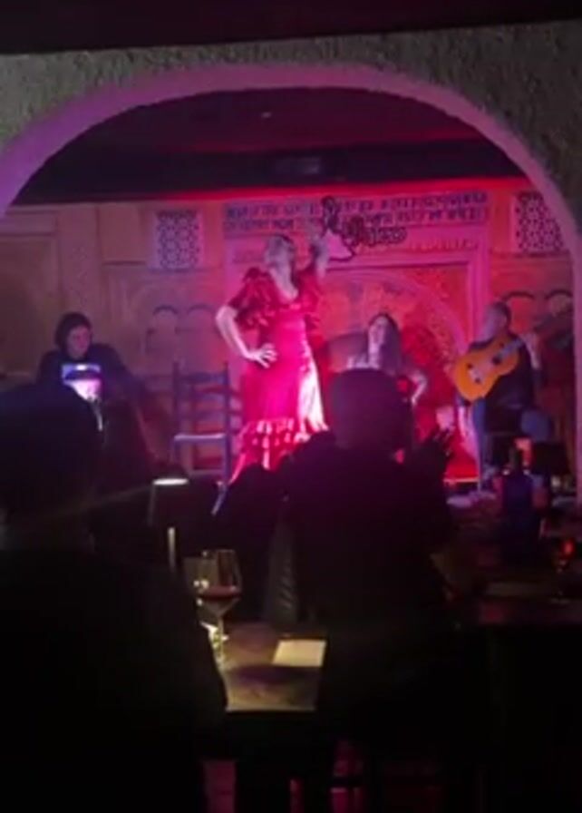 flamenco performance taking place in a restaurant with a dimly lit, intimate atmosphere. A woman dressed in a vibrant red flamenco dress is dancing energetically on a small stage. She is accompanied by a singer and a guitarist. The stage has a decorative Moorish-style backdrop with intricate patterns and warm lighting. In the foreground, restaurant patrons are seated at tables, some clapping and enjoying the performance, while one person is recording the event on their phone. Wine glasses are visible on the tables. The scene is viewed through an arched opening, adding to the framed, theatrical feel of the performance.
