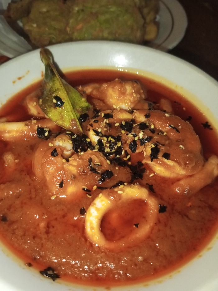 A close-up image displays a white ceramic bowl filled with a reddish-orange curry or stew. The dish contains several pieces of cooked shrimp and at least one circular calamari ring, garnished with scattered white sesame seeds and dark, fragmented flakes. A single, prominent green leaf, possibly a kaffir lime leaf, rests on the curry's surface. In the out-of-focus background, a light-colored plate holds a separate dish featuring green, leafy components, possibly fried vegetables. The setting appears to be indoors, on a dark table surface, under subdued lighting conditions. No individuals are present or engaged in visible actions or interactions. The observed location is Tagtse Tashidingkha, Bhutan.