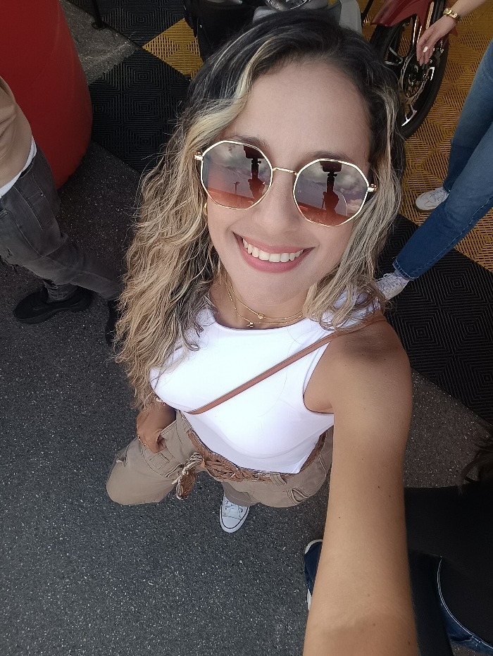 The image displays a female subject taking a selfie outdoors in Carrizal, Venezuela. The subject has long, wavy blonde hair with dark roots and is smiling, showing her teeth. She wears large, gold-rimmed octagonal sunglasses with reflective lenses displaying an orange hue and vertical structures. Her attire includes a white tank top, light brown cargo pants secured with a braided brown belt, and light blue/grey low-top sneakers. She also wears layered gold-colored necklaces and gold earrings. The ground is composed of dark asphalt and black-and-yellow checkerboard interlocking modular tiles. To the subject's immediate left, a portion of a large red inflatable object and the lower extremities of an individual in dark pants and black shoes are visible. To the subject's right, part of a red motorcycle, including a wheel and frame, is visible, along with the lower extremities of another individual in blue jeans and white sneakers, and a visible wrist with a gold watch.